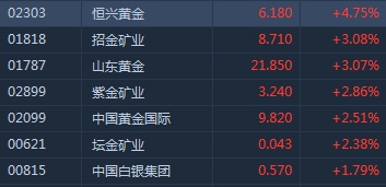 智通财经APP获悉,周一(6月24日),COMEX黄金期货收涨1.66%,报1423.3美元/盎司,再创近6年来新高。早盘港股黄金股再度走强,截至9时43分,山东黄金(01787)涨6.13%,报22.5港元。恒兴黄金(02303)涨4.92%,招金矿业(01818)涨4.62%,紫金矿业(02899)涨3.81%。