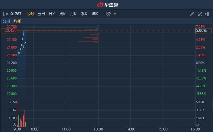 智通财经APP获悉,山东黄金(01787)早盘高开高走,截至9时44分,涨5.9%,报22.49港元,创近4个月新高,成交额达6481万港元。