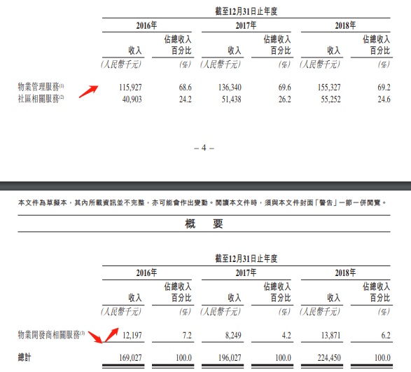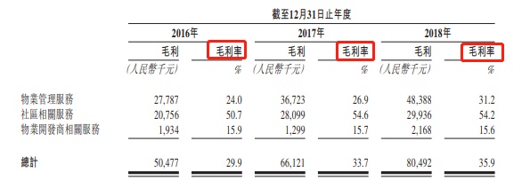 从毛利率上看,2016年、2017年及2018年截至12月31日止年度和泓服务物业管理服务的毛利率分别为24.0%、26.9%及31.2%;社区相关服务毛利率分别为50.7%、54.6%及54.2%;及物业开发商相关服务毛利率分别为15.9%、15.7%及15.6%,整体毛利率分别为29.9%、33.7%、35.9%。