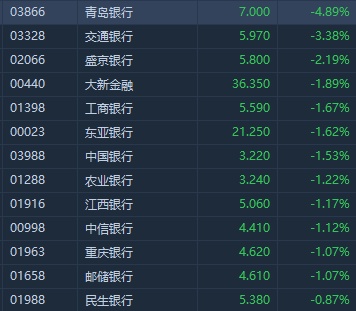 智通财经APP获悉,内银股早盘随大市悉数走低,截至发稿,青岛银行(03866)跌4.89%,交通银行(03328)跌3.38%,工行(01398)、中行(03988)、农行(01288)均跌超1%。