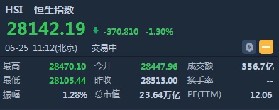 智通财经APP获悉,恒生指数低开低走,盘中低见28105.44点,截至11时12分,跌370.81点或1.3%,报28142.19点,成交额暂为356.7亿。