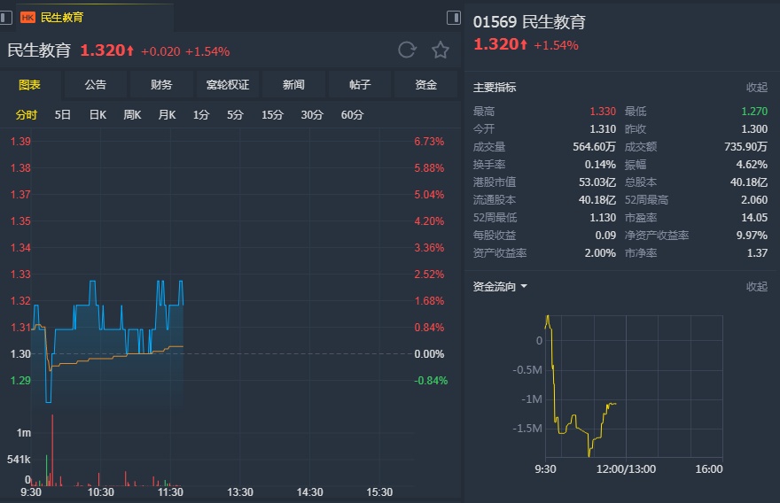 该行又称,民生教育股价表现疲弱,可能是由于内地民办教育促进法实施条例最终定稿或有所延迟,以及有投资者要减少损失出售股份。而集团无论在监管层面或公司层面的基本面大致保持不变,因此认为其股价表现已脱离基本面。