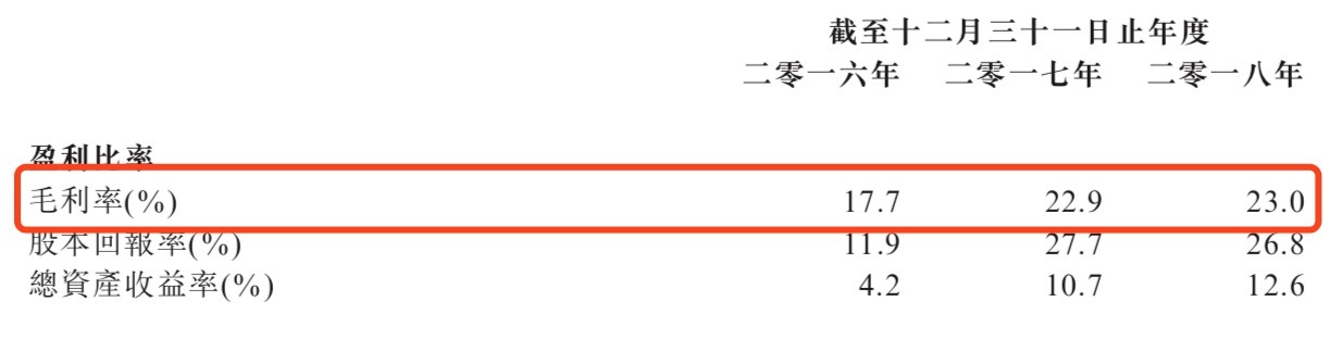 毛利率由截至2016年12月31日止年度的约17.7%增加至截至2017年12月31日止年度的约22.9%,及于截至2018年12月31日止年度维持相对稳定,为23.0%。