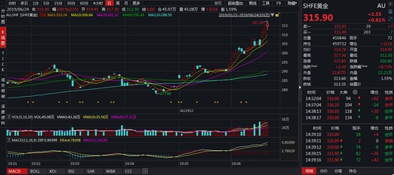 智通财经APP了解到,日前在经济数据走弱的情况下,美联储持续释放降息预期,再加上此前世界黄金协会日前发布报告称,全球各国央行2019年第一季度共购入145.5吨黄金,同比增长68%,央行购金成为推动全球黄金需求增长的一个重要因素,多重利好推动黄金价格疯涨,近期连续上扬的SHFE黄金价格指数近乎是直线拉升,截止6月24日创出六年多来的317.3点新高,整个黄金市场高景气态势明显。
