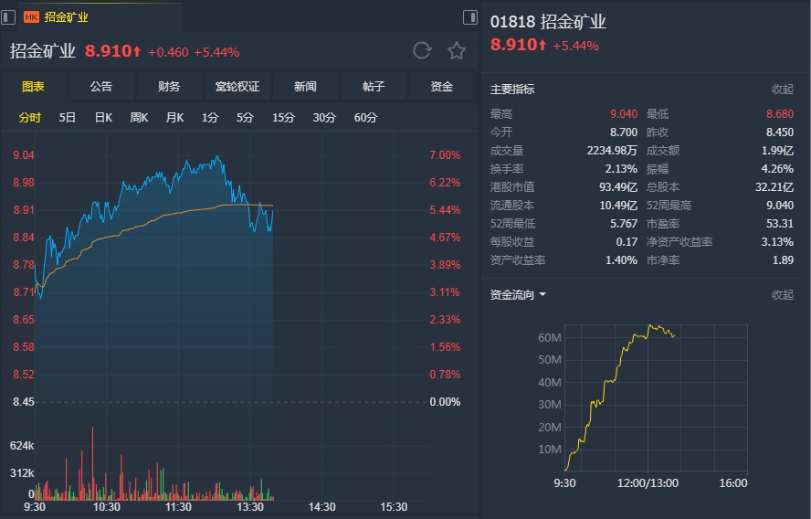 该行预期,国际金价未来会持续上升,并指出招金矿业作为该行对中资黄金股的首选,相信可受惠于金价走强。而该行估计,美联储于7月份会减息50个基点,该行预计金价每升1%,可提升招金纯利约3.8%。