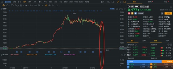 2016年上市后不到两年的时间,星亚控股(08293)涨幅超过了34倍,最高市值高达88亿港元的,之后在高位盘整了一年后,于2019年6月25日暴跌96.48%,市值仅剩2亿多港元。