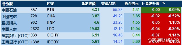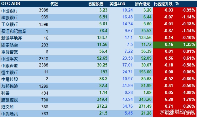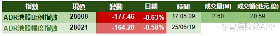 智通财经APP获悉,隔夜美股全面下挫,拖累港股ADR指数全日偏软,按比例计算,收报28008点,跌177.46点或0.63%。大型蓝筹受压,汇丰控股收报64.02元,较港收市跌0.08元;腾讯控股收报343.2元,较港收市跌6.2元。