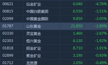 智通财经APP获悉,COMEX黄金期货高位回吐,港股黄金股随A股集体走弱。截至10时16分,中国黄金国际(02099)跌3.05%,报价9.85港元,山东黄金(01787)跌2.89%,灵宝黄金(03330)跌2.67%,紫金矿业(02899)跌0.93%。