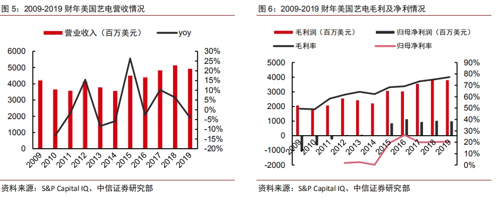 2019 财年,EA 实现营收 49.40 亿美元(YoY -4.0%),毛利润 38.20 亿美元(YoY -1.4%),归母净利润 10.20 亿美元(YoY -2.3%),毛利率和归母净利率分别为 77.2%(+2.0pcts)和 20.6%(+0.4pct)。