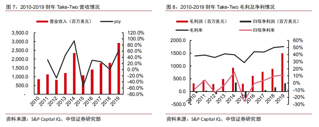 2019 财年,Take-Two 实现营收 29.30 亿美元(YoY +63.4%),毛利润 15 亿美元(YoY+67.9%),归母净利润 3.30