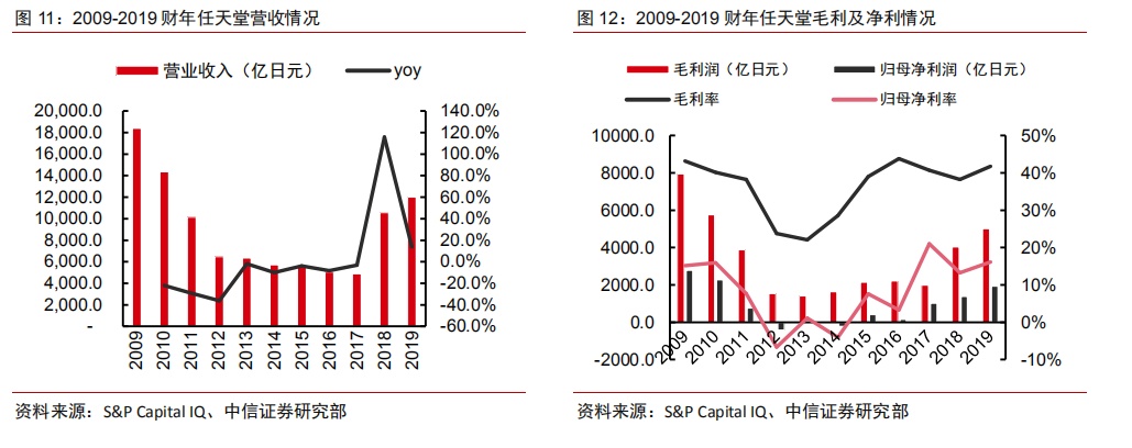 2019 财年,任天堂实现营收 12005.6 亿日元(YoY +13.7%),毛利润 5011.89 亿日元(YoY +24.2%),归母净利润 1940.1 亿日元(YoY +39.0%),毛利率和净利率分别为 41.7%(YoY +3.5pcts)和 16.2%(YoY +2.9pcts)。