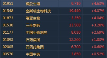 智通财经APP获悉,受惠于美制药股大型并购活动,带动港股医药股集体上扬,截至11时33分,次新股锦欣生殖(01951)涨4.63%,金斯瑞(01548)涨4.07%,次新股维亚生物(01873)涨4.04%,三生制药(01530)涨3.2%,中生制药(01177)涨2.69%,石药(01093)涨1.83%。