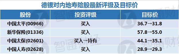 该行首选国寿及中国平安,同时将太保评级自“买入”降级至“持有”,目标价自44.1港元下调至35.1港元。以下为德银对内地寿险股最新评级及目标价: