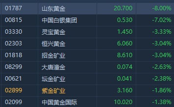智通财经APP获悉,黄金股今日普遍回吐,午后跌幅持续扩大,截至发稿,山东黄金(01787)跌8%,中国白银集团(00815)跌7.02%,恒兴黄金(02303)、灵宝黄金(03330)均跌逾3%,紫金矿业(02899)跌1.86%。