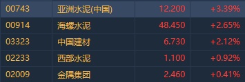 智通财经APP获悉,水泥股今日个股普涨,截至发稿,亚洲水泥(中国)00743涨3.39%,海螺水泥(00914)、中国建材(03323)涨超2%,西部水泥(02233)涨0.92%。