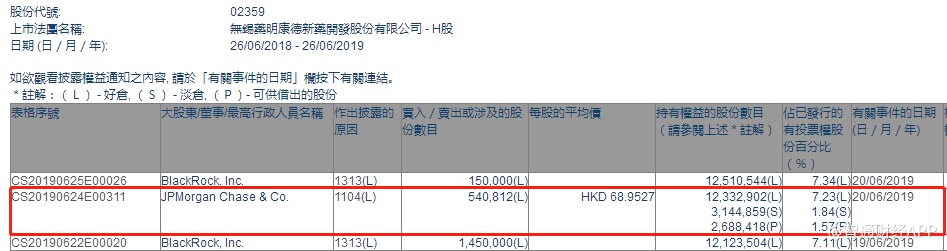智通财经APP获悉,根据联交所资料显示,摩根大通于6月20日增持药明康德(02359)54.08万股,每股作价68.95港元,总值约3728.82万港元,最新持股数目约1233.29万股,最新持股比例为7.23%。