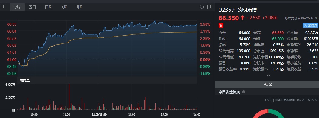 截至今日收盘,药明康德(02359)涨3.98%,报66.55港元。