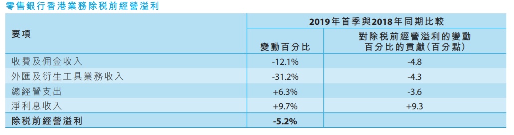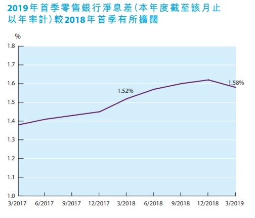 此外,受惠于较高的利息水平,零售银行净息差由2018年首季的1.52%,扩阔至2019年首季的1.58%。