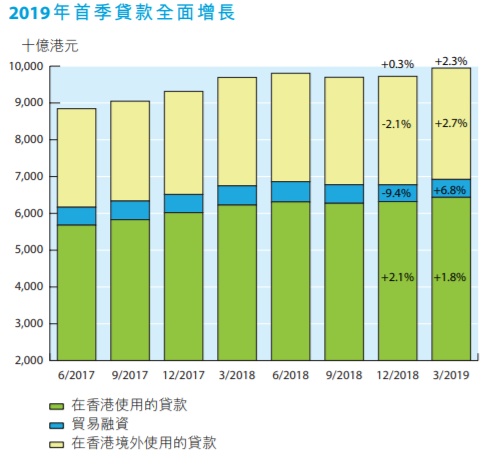 而银行业贷款总额在2019年首季温和增长2.3%,其中在香港使用的贷款增加1.8%,在香港境外使用的贷款增加2.7%,贸易融资则增加6.8%。由于首季贷款总额的增长速度较存款总额快,银行业贷存比率由2018年12月底的72.6%微升至2019年3月底的73.4%。