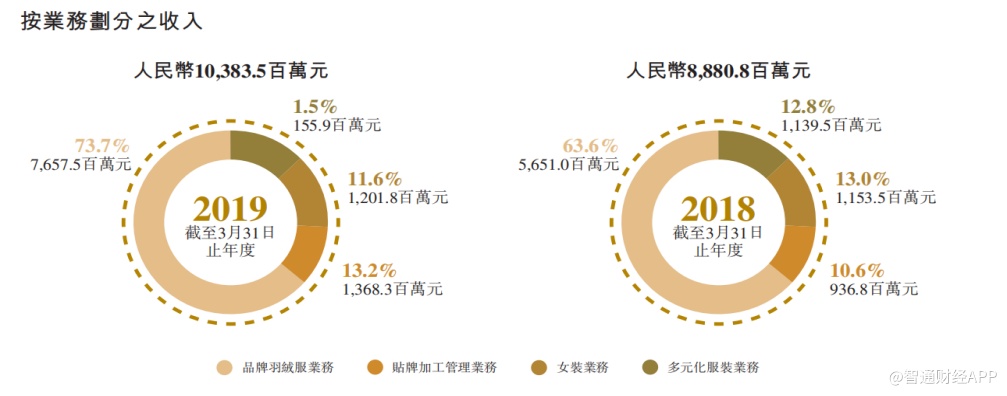 细分来看,截至2018/19财年,波司登拥有品牌羽绒服、贴牌加工管理、女装及多元化服装,四大主营业务单元。其中,品牌羽绒服业务实现收入6.58亿元,同比增长35.5%,该业务占收入比重提升10.1个百分点至73.7%;贴牌加工管理业务实现收入13.68亿元,同比增长46.1%;女装业务实现收入12.02亿元,同比增长4.2%;多元化服装业务按照战略规划收缩,营收为1.56亿元,总收入比重为1.5%。