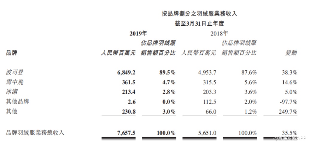 线上渠道方面,在2018/19财年,波司登品牌羽绒服业务及女装业务在线销售的收入分别约为17.66亿元及0.68亿元,同比上升55.6%及11.8%,其中,品牌羽绒服业务占该业务收入比重提升至23.1%。