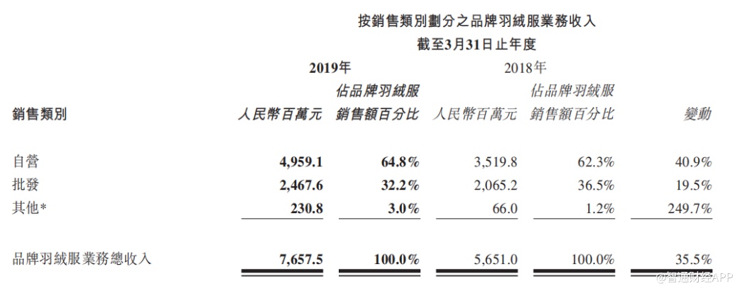 分渠道来看,波司登自营品牌羽绒服在实现收入达到49.59亿元,同比增长40.9%,批发渠道收入为26.68亿元,同比增长19.5%。