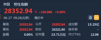 智通财经APP获悉,恒生指数开盘涨0.46%,报28352.94点。国企指数涨0.55%,报10824.87点。红筹指数涨0.59%,报4420.3点。大市盘前成交15.23亿港元。