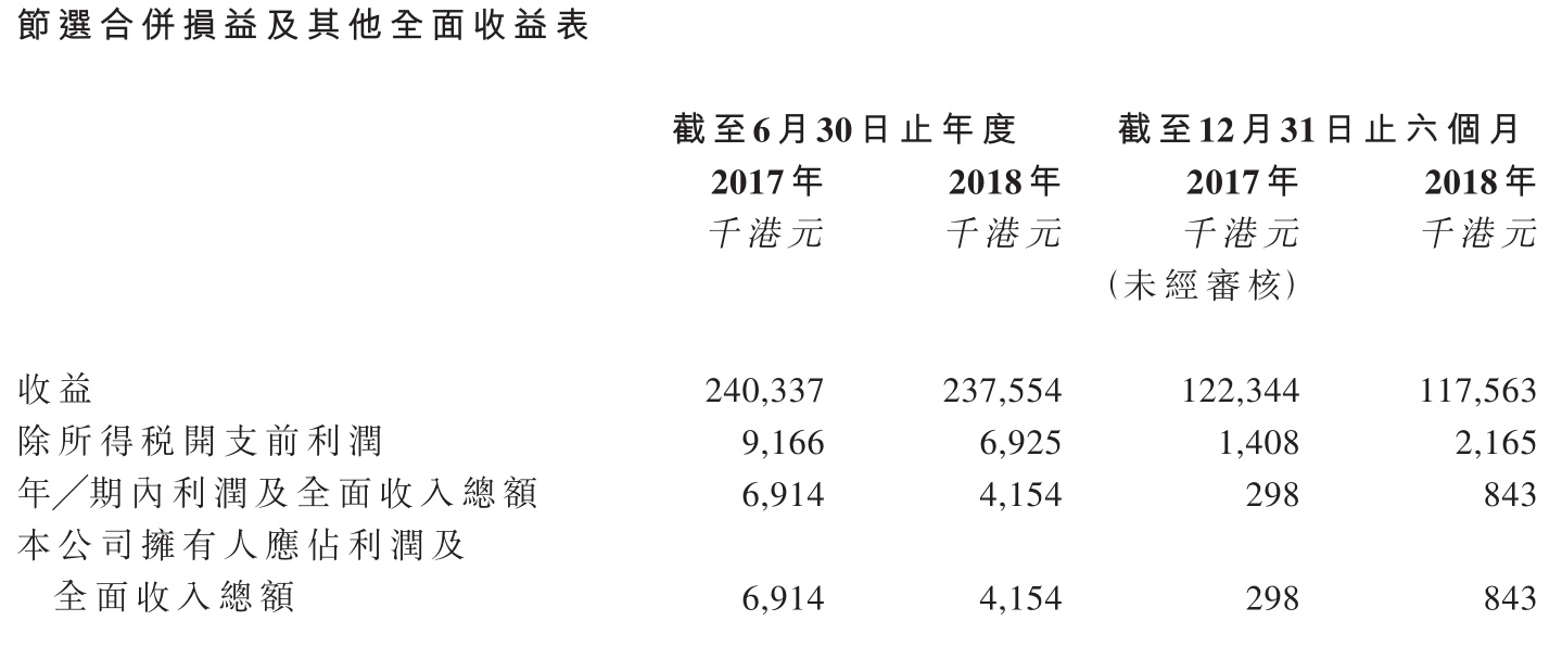 招股书显示,截至2018年6月30日止年度,公司收益为2.38亿港元,同比降低0.8%,公司拥有人应占利润为415.4万港元,同比下降40%;截至2018年12月31日止6个月,公司收益为1.18亿港元,同比下降3%,公司拥有人应占利润为84万,同比增长180%。