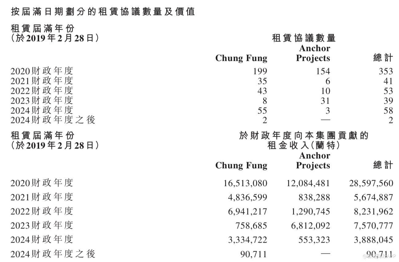 如上表所示,于 截 至2020年2月29日、2021年2月28日、2022年2月28日、2023年2月28日、2024年2月29日及2024年2月29日之后止财政年度,该集团购物商场中分别有353个单位、41个单位、53个单位、39个单位、58个单位及2个单位的租赁协议将会到期,于相应财政年度对本集团的租金收入贡献分别约为28,597,560兰特、5,674,887兰特、8,231,963兰特、7,570,777兰特、3,888,045兰特及90,711兰特。