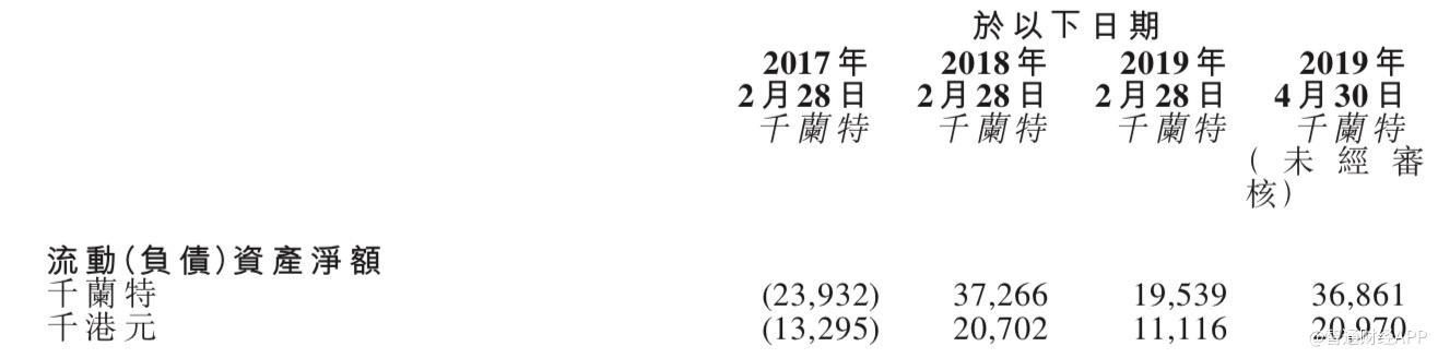 招股书显示,于2017年2月28日录得流动负债净额约23.9百万兰特。于2017年2月28日的流动负债净额乃主要归因于(i)其他应付款项约99.1百万兰特,包括向租户收取的保 证金、其他应付税项以及其他应付款项及应计费用;(ii)应付一名董事款项约23.8百万 兰特;及(iii)应付税项分别约25.0百万兰特。