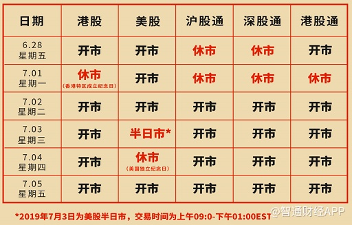此外,因美国独立纪念日,美股周三(7月3日)为半日市,周四(7月4日)休市一天。
