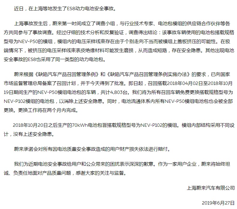 蔚来承诺会对所有因电池质量安全事故造成的用户财产损失依法进行赔付。