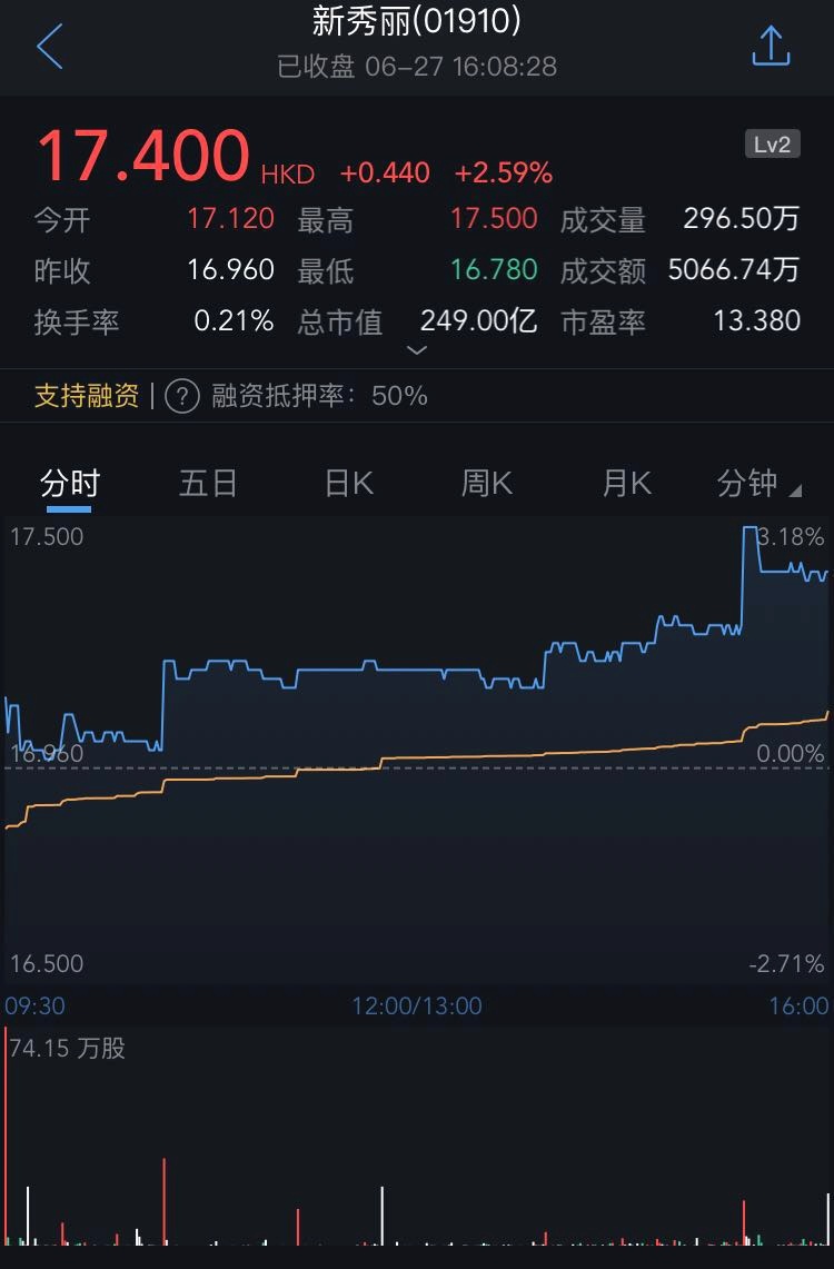 截至今日收盘,新秀丽(01910)涨2.59%,报17.4港元。