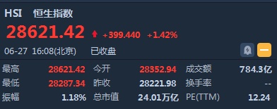 智通财经APP获悉,恒指高开0.46%,报28352.94点。截至收盘,恒生指数涨399.44点或1.42%,报28621.42点,全日成交额达784.31亿。国企指数涨1.22%,报10897.13点,红筹指数涨1.25%,报4449.31点。