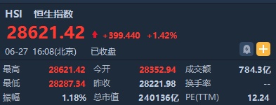 截至收盘,恒生指数涨399.44点或1.42%,报28621.42点,全日成交额达784.3亿。国企指数涨1.22%,报10897.13点,红筹指数涨1.25%,报4449.31点。