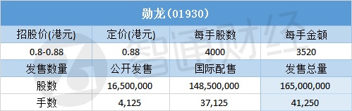 智通财经APP获悉,6月27日,勋龙(01930)配售结束。配售招股价区间为0.8-0.88港元,最终定价0.88港元,每手3520港元。