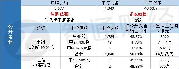 其中,公开配售申购人数3577,一手中签率40%,认购倍数约6.01倍。