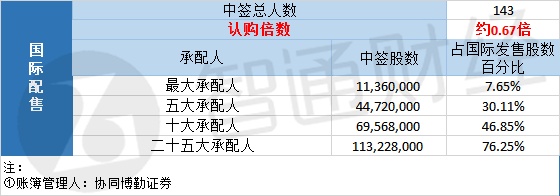 国际配售中签人数约143人,认购倍数约0.67倍。