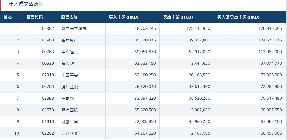 万洲国际(00288)、舜宇(02382)虽收涨3.68%、4.03%,仍遭8117.41万港元、7940.98万港元北水净卖出。