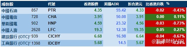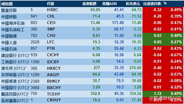 智通财经APP获悉,美股表现涨跌不一,港股ADR指数则全日微跌,按比例计算,收报28571点,跌50.11点。大型蓝筹个别发展,汇丰控股收报64.73元,较港收市跌0.32元;腾讯控股收报354.52元,较港收市升1.72元。