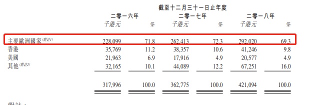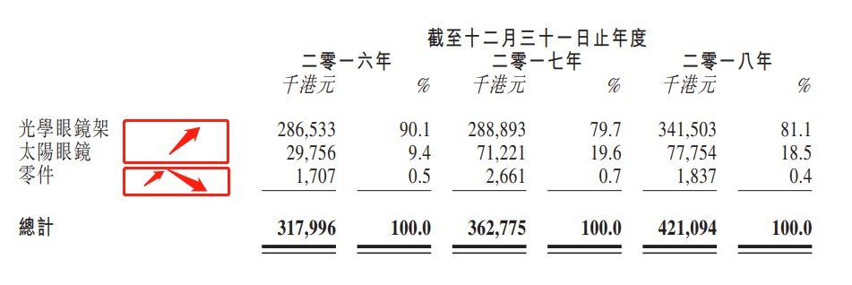 据弗若斯特沙利文报告称,就其贸易价值而言,公司的销售覆盖所有2017年全球十大光学眼镜架进口国家。其中,截至2017年12月31日止2个年度及截至2018年9月30日止9个月,公司对欧洲的销售额分别合共占公司收益超过70%。据悉,公司的产品主要包括光学眼镜架及通常由金属或醋酸脂或两者混合制成的太阳眼镜。于往绩记录期,公司制造合共超过3200种光学眼镜架及太阳眼镜的多元化产品组合。