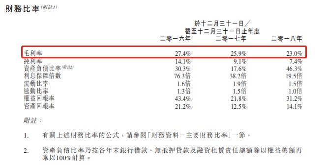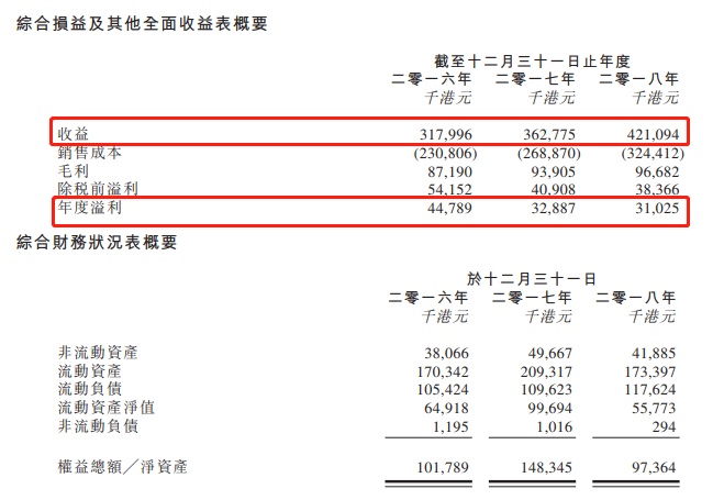 截至2016年、2017年、2018年12月31日止3个年度,公司实现收益分别为3.18亿港元、3.63亿港元及4.21亿港元;年度溢利分别为4478.9万港元、3288.7万港元及3102.5万港元;毛利率分别为27.4%、25.9%以及23.0%,毛利率逐步走低主要受平均售价减少所致。