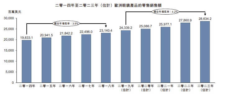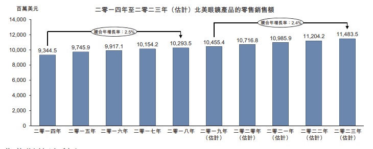 根据弗若斯特沙利文报告,北美眼镜产品零售总额由2014年的约93.44亿美元按2.5%的复合年增长率增至2018年的约102.94亿美元。预计北美眼镜产品的零售额在2019年至2023年期间将以2.4%的复合年增长率增长至114.83亿美元。欧洲市场眼镜零售总额由2014年的198.33亿美元增至2018年的231.40亿美元,复合年增长率为3.9%。预计2019年至2023年欧洲眼镜零售额将以4.2%的年均复合增长率增长至286.34亿美元。