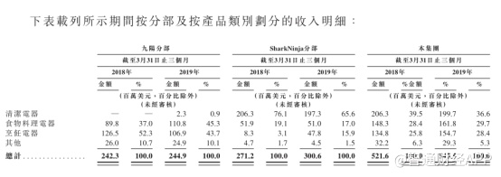 来自SharkNinja分部的收入由截至2018年3月31日止三个月的2.71亿美元上升10.9%至截至2019年3月31日止三个月的3.00亿美元,烹饪电器品类项下Foodi系列的销量增长,但于美国零售商在2019年第一季度调低了採购量。