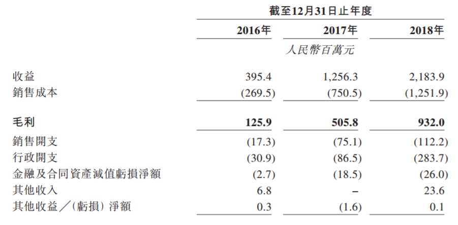 于2016年、2017年及2018年,该公司的毛利分别为125.9百万元、505.8百万元及932百万元;利润为59.8百万元、270.1百万元及416.7百万元。