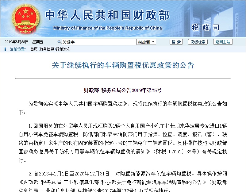 关于继续执行的车辆购置税优惠政策的公告