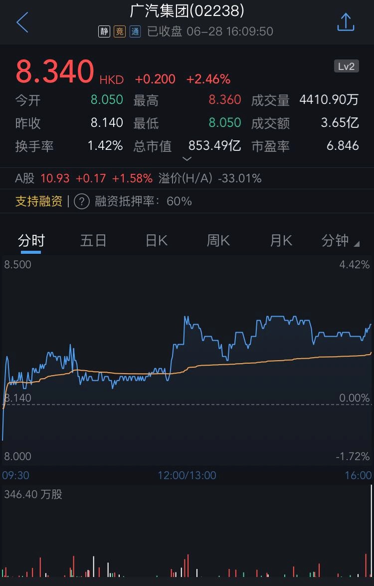 截至今日收盘,广汽集团(02238)涨2.46%,报8.34港元。