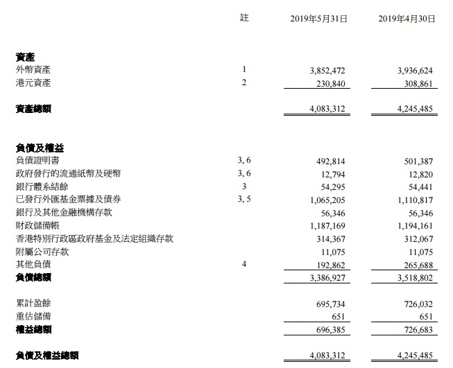 货币发行局帐目显示,2019年5月底的货币基础为16,236亿港元,较2019年4月底减少63亿港元,减幅为0.4%。货币基础减少,主要是由于负债证明书总额下降。