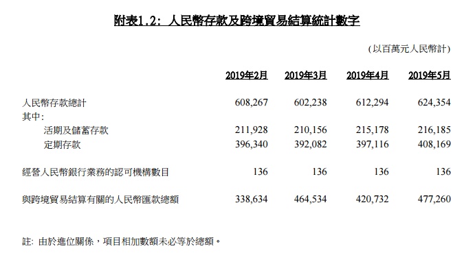 2019年5月份认可机构的存款总额下跌1.0%。由于储蓄、活期及定期存款均录得跌幅,港元存款于月内下跌1.0%。5月份外币存款总额亦减少1.0%,其中香港人民币存款增长2.0%,于5月底为6,244亿元人民币。跨境贸易结算的人民币汇款总额于5月份为4,773亿元人民币,而4月份的数字为4,207亿元人民币。