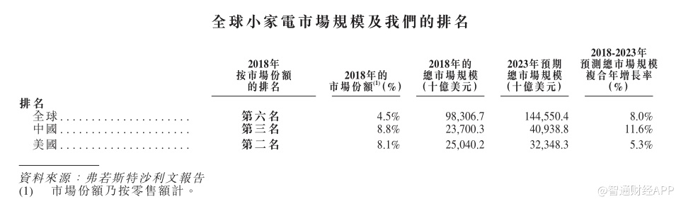 JS环球生活与A股九阳股份同样专注于小家电的开发、制造及营销。经过多年的发展,JS环球生活目前拥有多个备受信赖的市场领先品牌:九阳、Shark、Ninja,集团持续在全球小家电市场保持领先地位。根据弗若斯特沙利文的报告,以市场份额计算,JS环球生活于2018年在小家电企业中分别排名全球第六和中国第三。